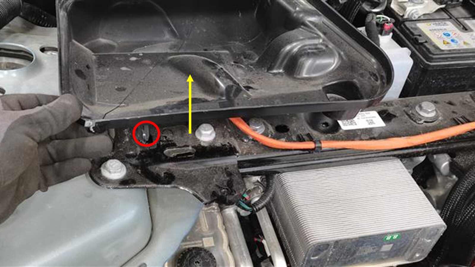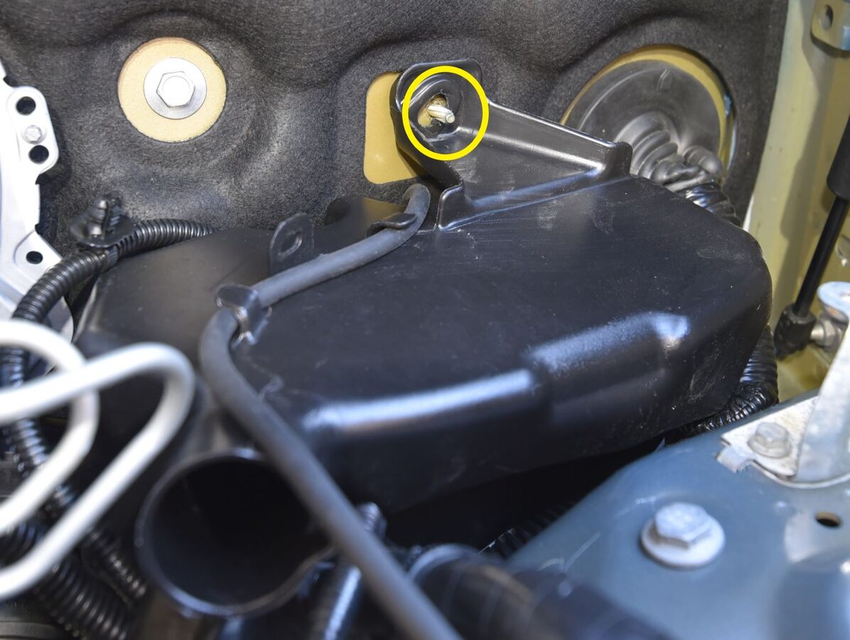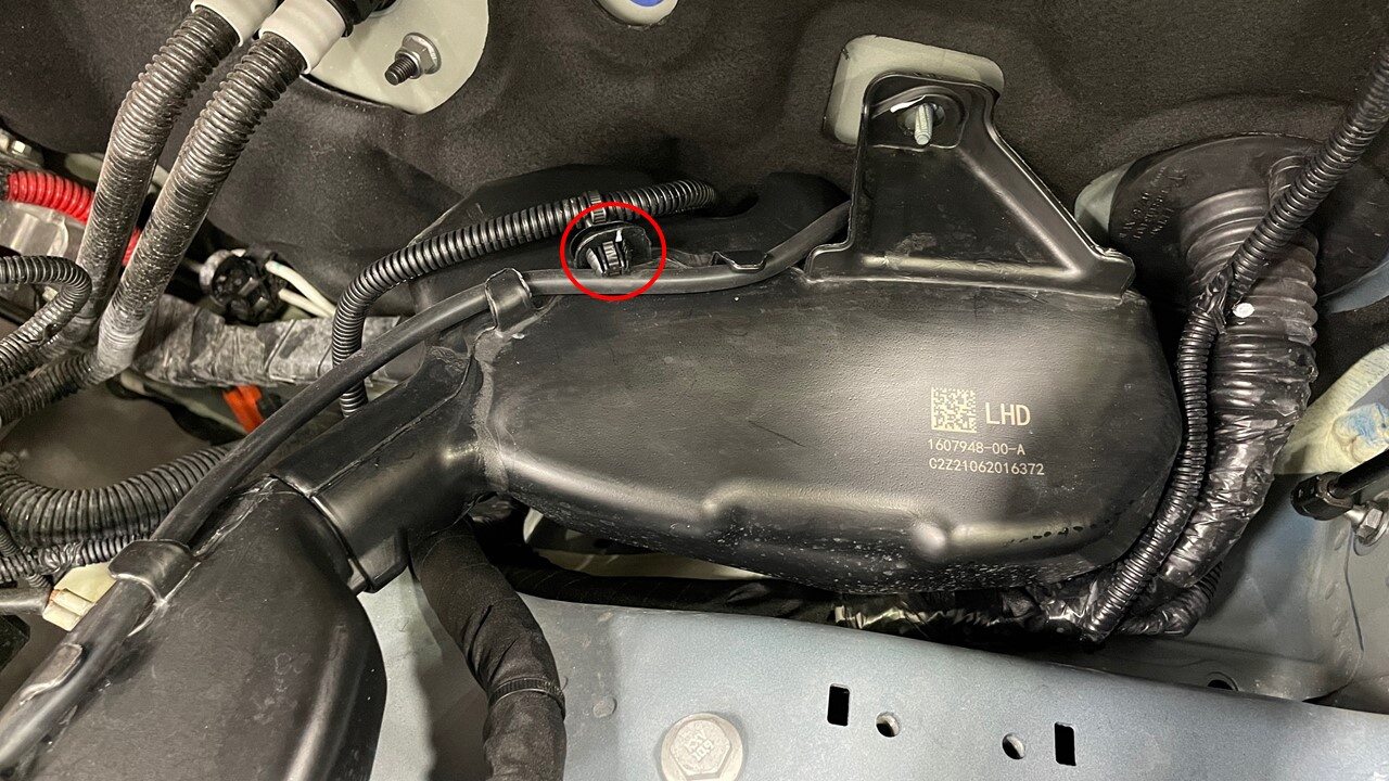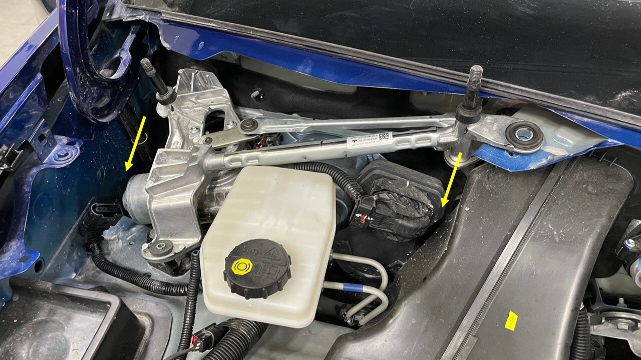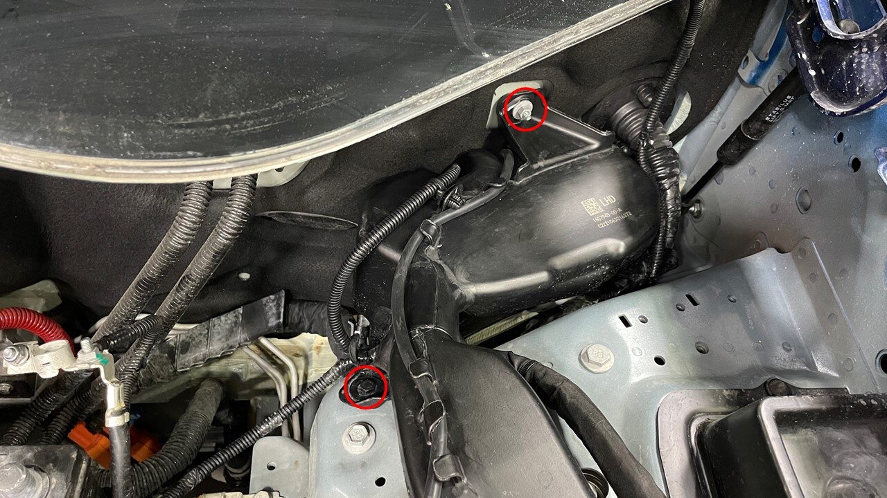 注5x bolts, 10mm, 5 Nm, Newer vehicles may be equipped with 4x bolts and 1x push clip securing frunk to reservoir neck