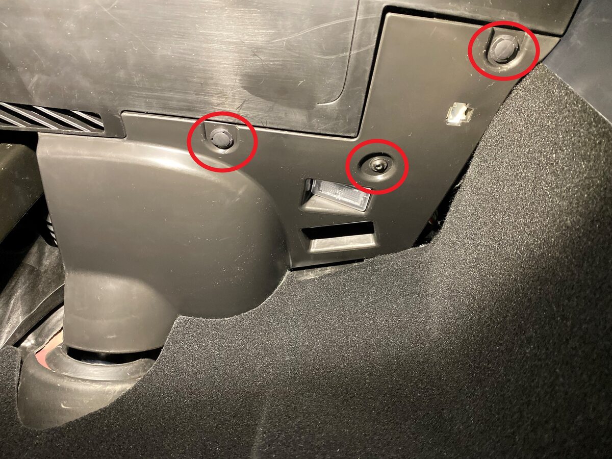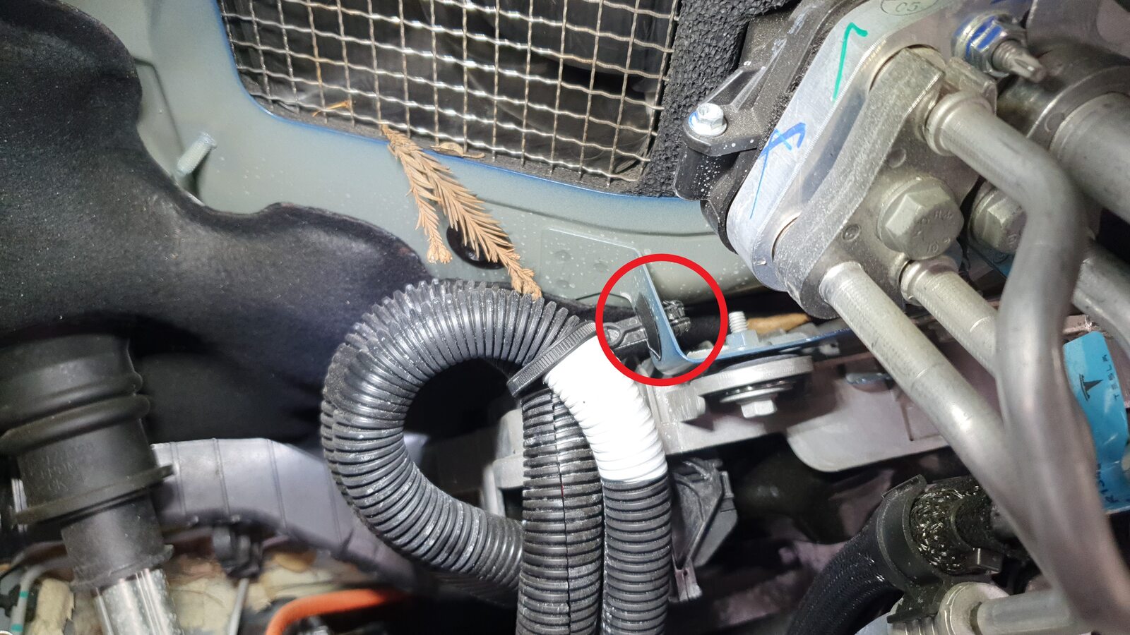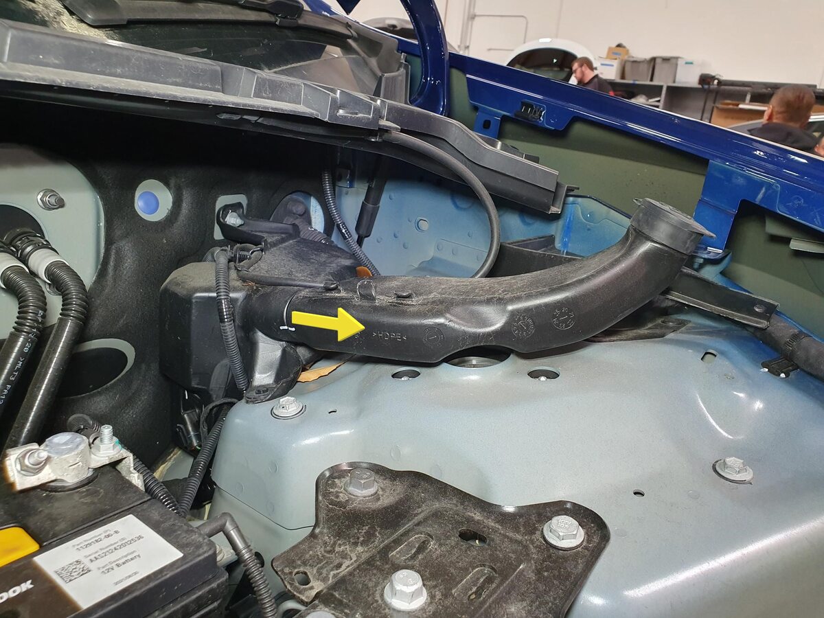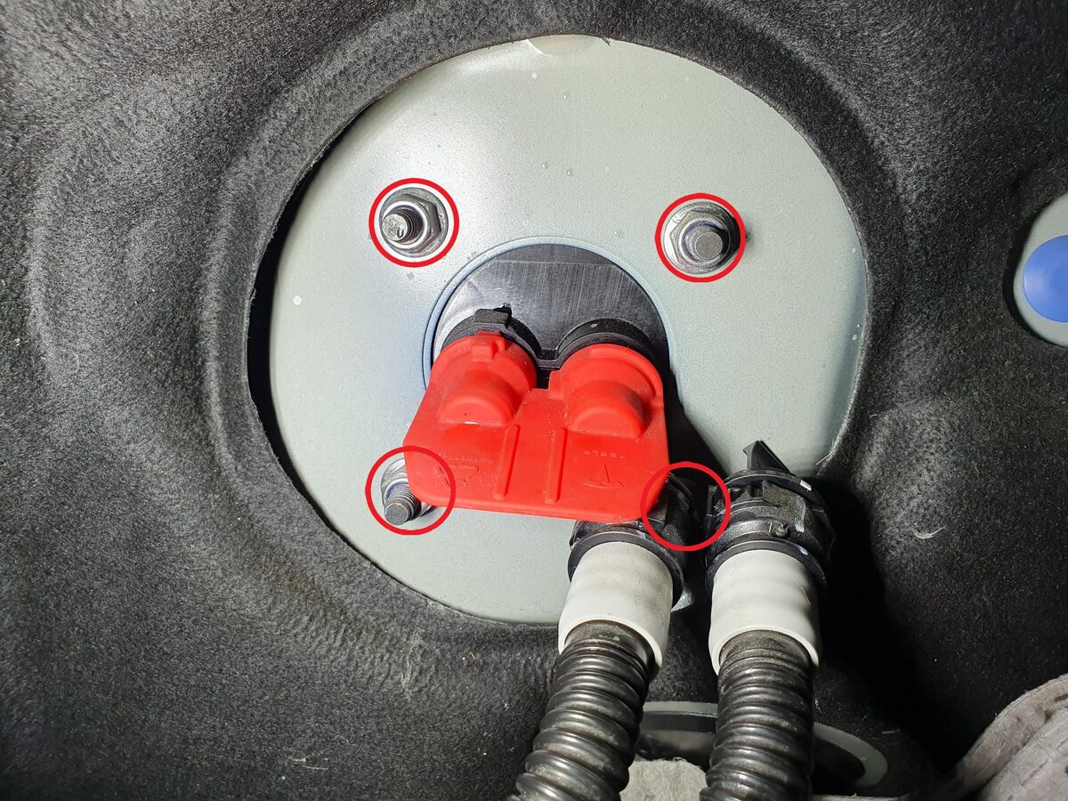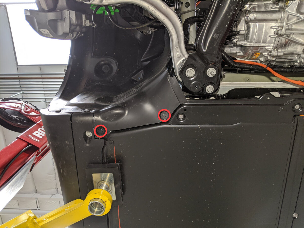 注5x bolts, 10mm, 5 Nm, Newer vehicles may be equipped with 4x bolts and 1x push clip securing frunk to reservoir neck