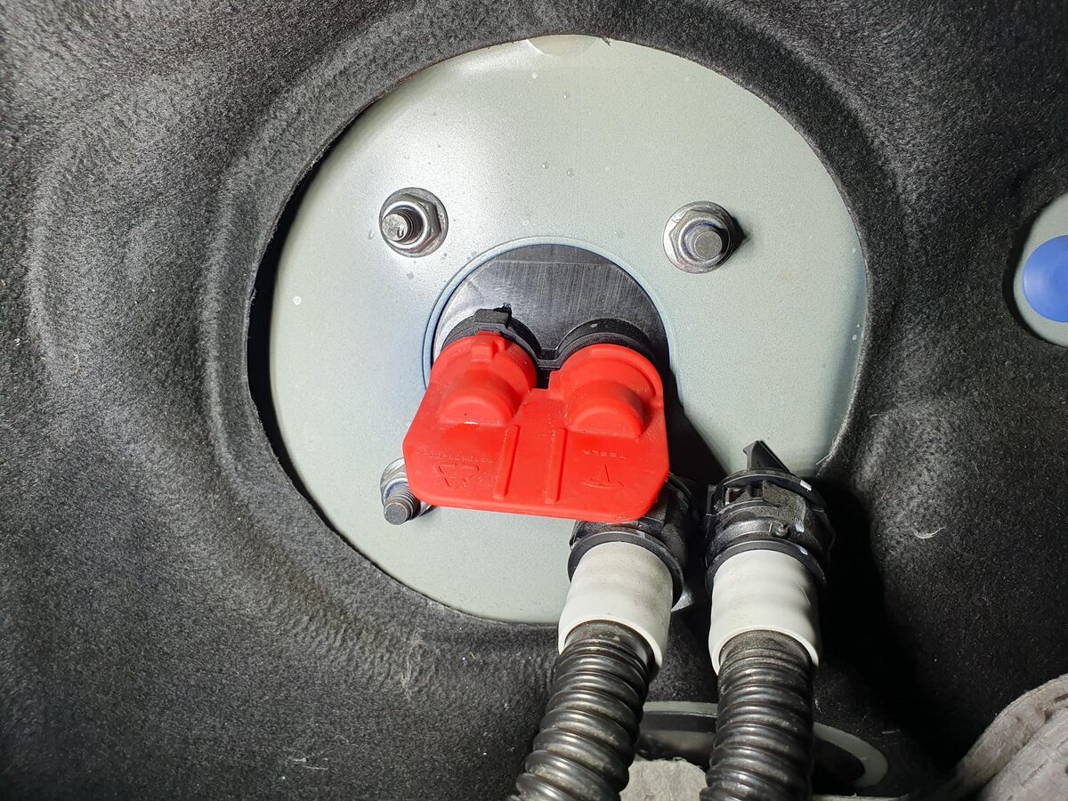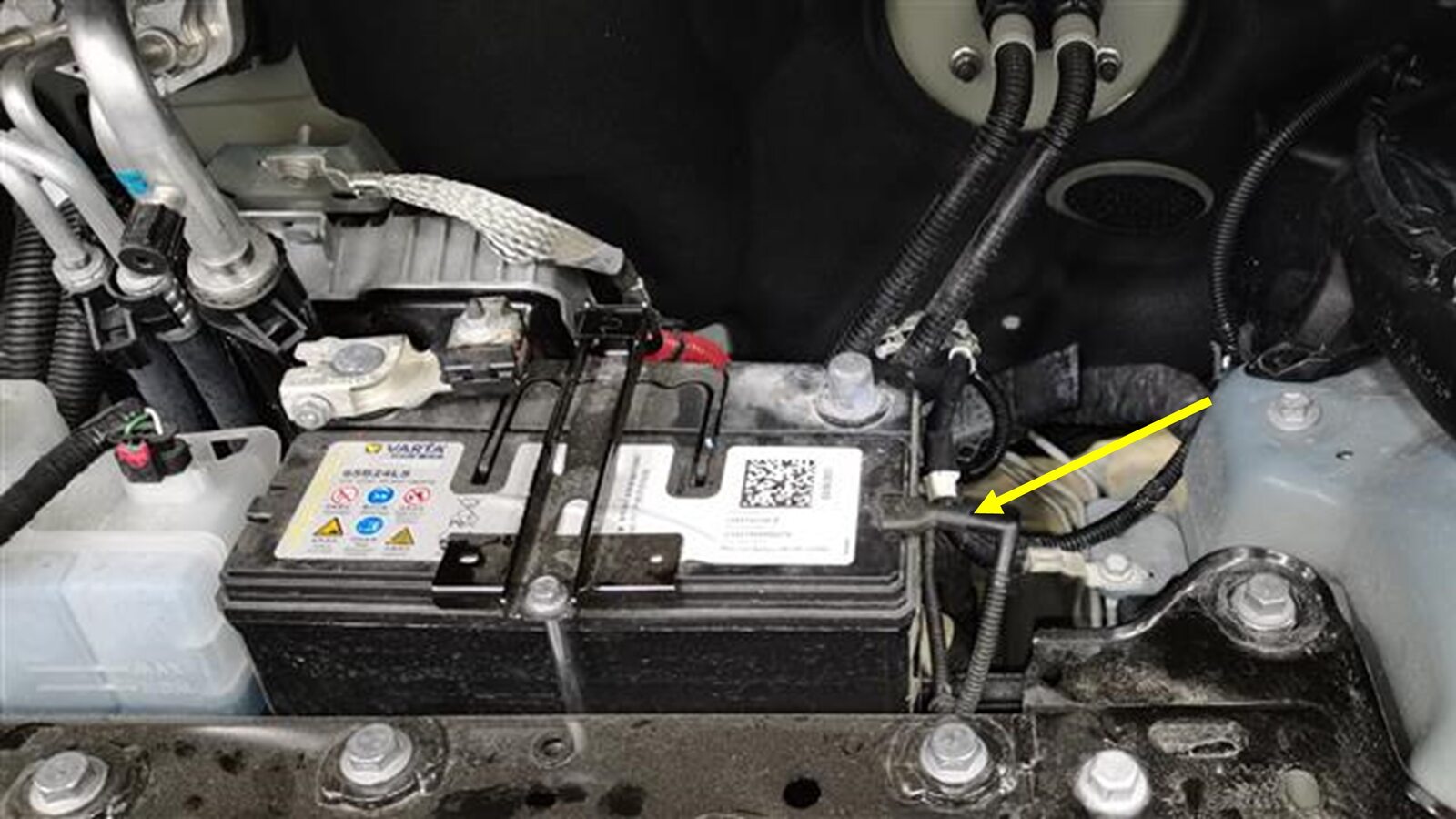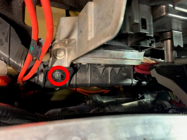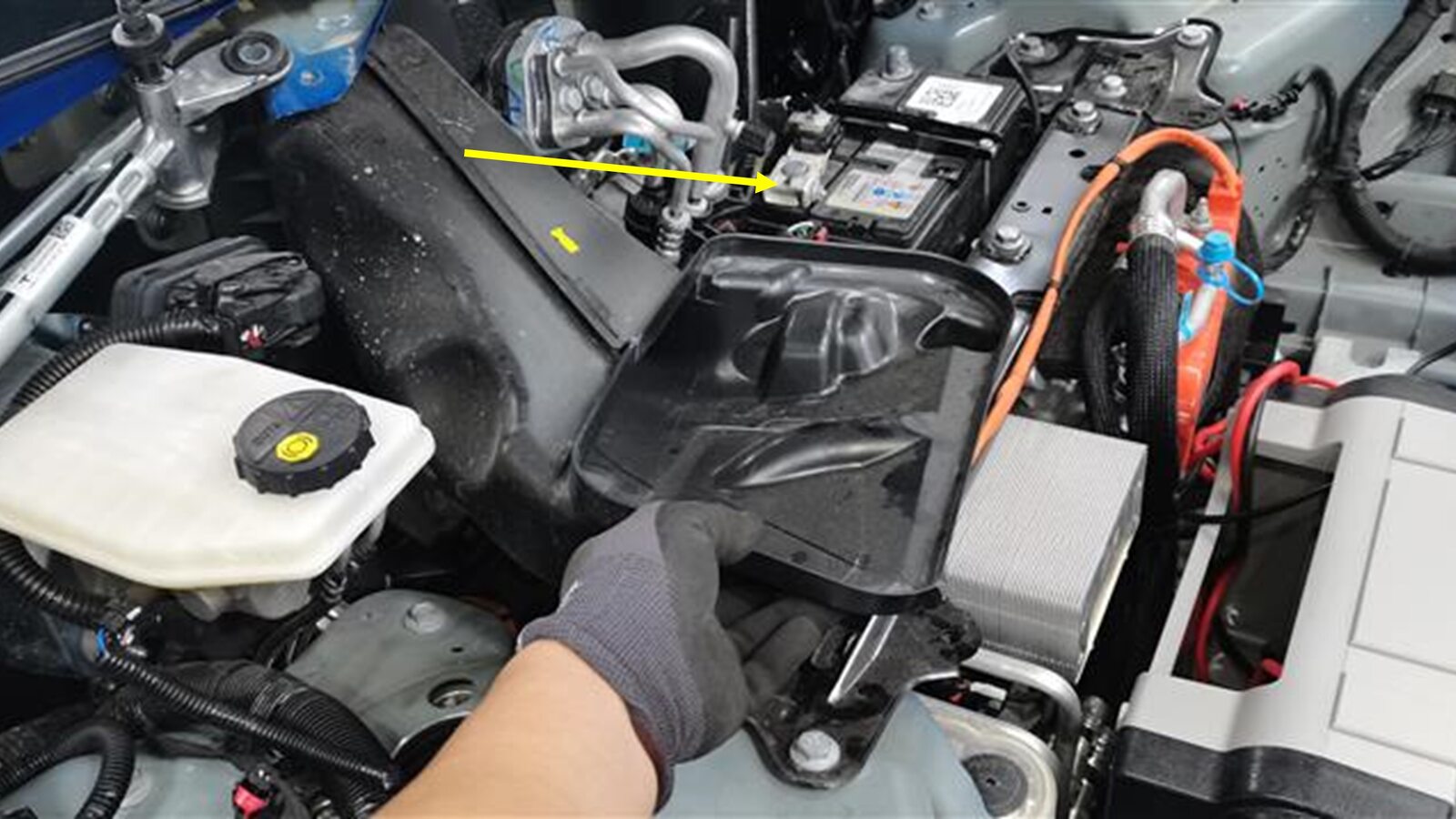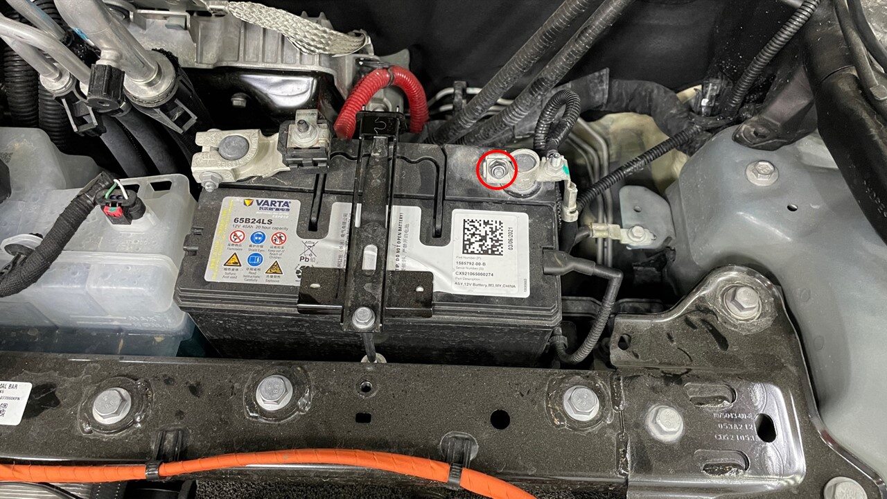 注1x nut, 10mm, 6 Nm, 1x connector, Ensure vehicle is in park, climate control system is off, and vehicle is not charging before disconnecting 12V, Negative terminal should be disconnected before FRL, Allow 2 minutes for all electrical circuits to fully discharge