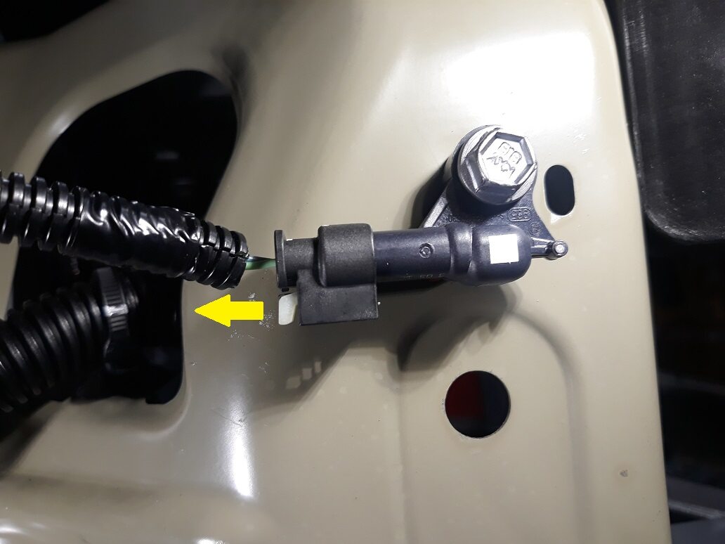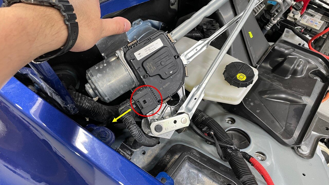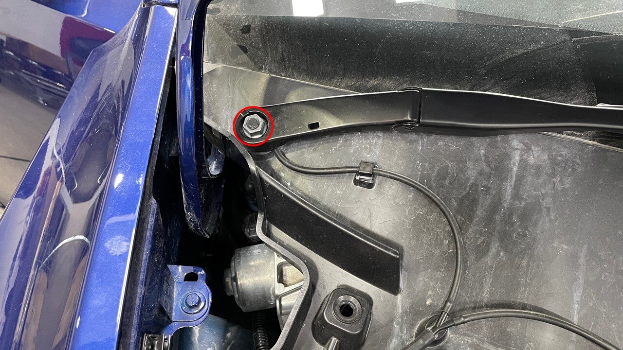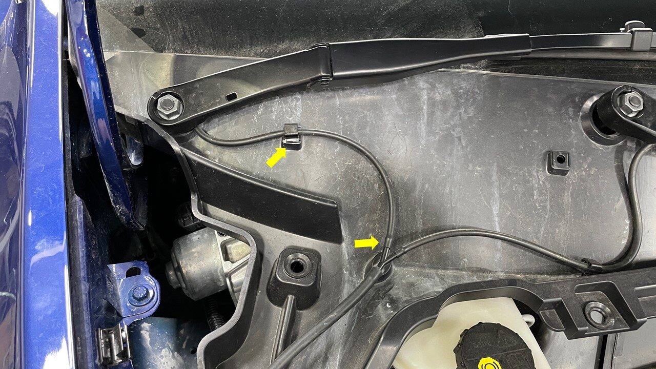 Disconnect washer hose from LH wiper arm to Y-tube fitting and release washer hose clip