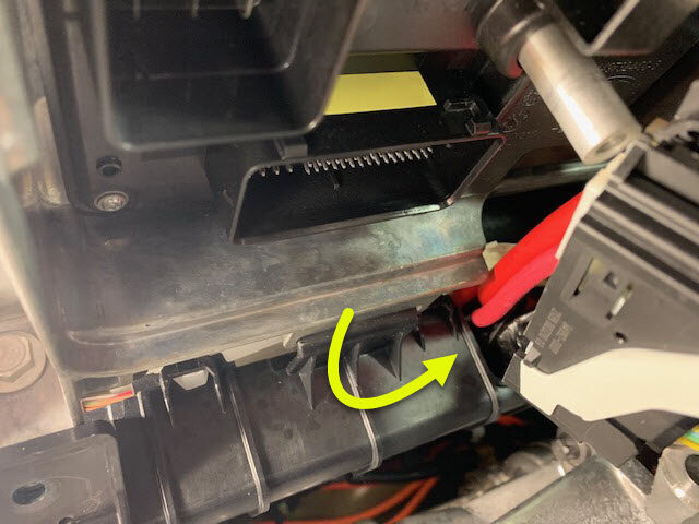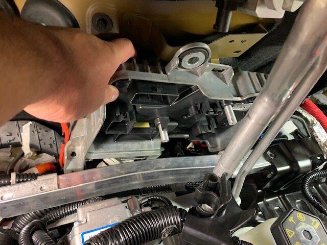 Remove bolt securing 12V battery upper tie down strap to AC compressor bracket