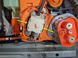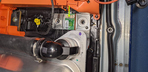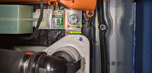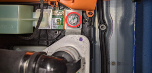 注2x bolts, 10mm, 5 Nm, Pivot forward edge down past frunk assembly, then carefully move rear edge past brake reservoir and into position