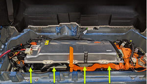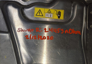 注2x HV joints, The acceptable resistance is between 0.050 mΩ (50 μΩ) and 0.195 mΩ (195 μΩ).If the resistance is greater than 0.195 mΩ (195 μΩ), there is too much resistance in the High Voltage joint. Remove the fastener, clean areas with isopropyl alcohol, install fastener back and test again.If the resistance is lower than 0.050 mΩ (50 μΩ), reposition the probes and measure again.If the resistance is repeatedly between 0.00 mΩ and 0.050 mΩ (50 μΩ), hioki test passed, proceed to next step