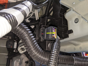 - 从 LH 前滑轨支架的另一侧松开连接器锁,然后朝车辆前部断开前副框架线束。