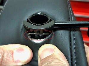 - 下压内侧座椅头枕柱 LH 侧上的材料(头枕下方),露出将头枕柱固定到驾驶位靠背的固定弹簧。