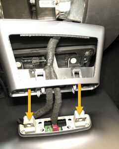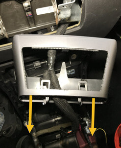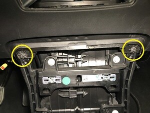 注12 个夹子,2 个定位销;使用饰板工具从顶部边缘开始松开上部夹子;拉动底部以便松开其余夹子;小心将面板径直拉出控制台,如若面板脱落,可能会损坏
