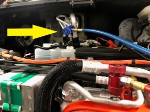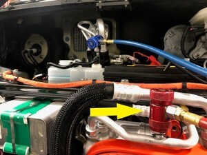 注确保压缩机和鼓风机都处于关闭状态,这样驾驶室冷凝器内部的制冷剂才可以返回蓄压器
