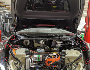 注5 个螺栓,10 毫米,5 Nm;新款车可能加装了 1 个将前备箱固定到储液罐颈部的推拉式卡子