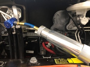 注开启空调;温度设置为“低”;开启“面板”模式;开启“新鲜空气”模式;鼓风机转速设置为 3;将机器阀门转为“开”;稳定压力,从车辆上拆下下方软管;继续按空调机指南操作,清理空调软管