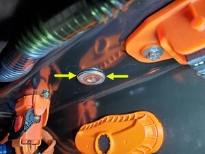 注2x bolts, 10mm, 5 Nm, Pivot forward edge down past frunk assembly, then carefully move rear edge past brake reservoir and into position