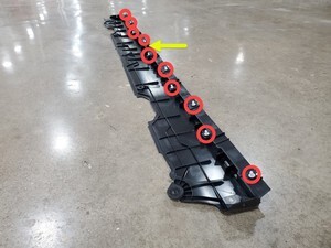 注10x clips, 1x datum, Use pry tool to release clips and prevent damage to carrier, Negotiate carrier around rear wheel liner then front wheel liner