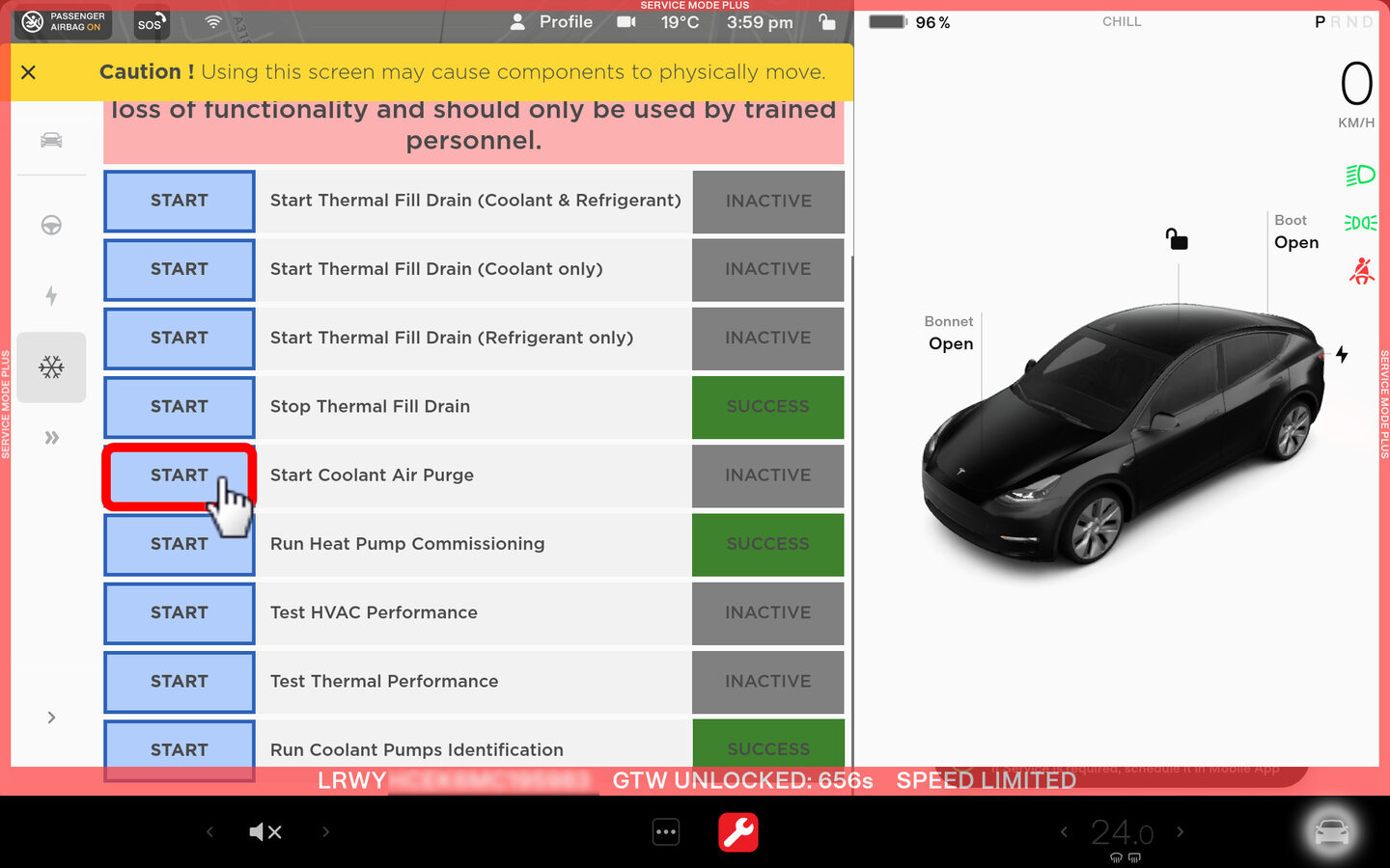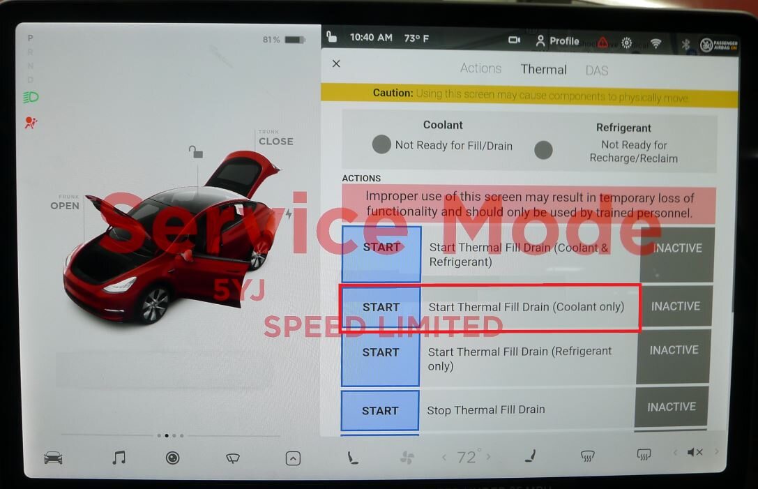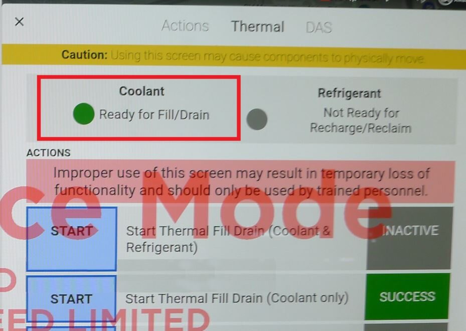 注Touch the X at the top left of window to close once completed.注Verify the indicator displays green and the vehicle is ready for the coolant fill/drain.注Thermal "Fill Drain" routine has a 5 hour time limit. After 5 hours, the routine must be performed again.