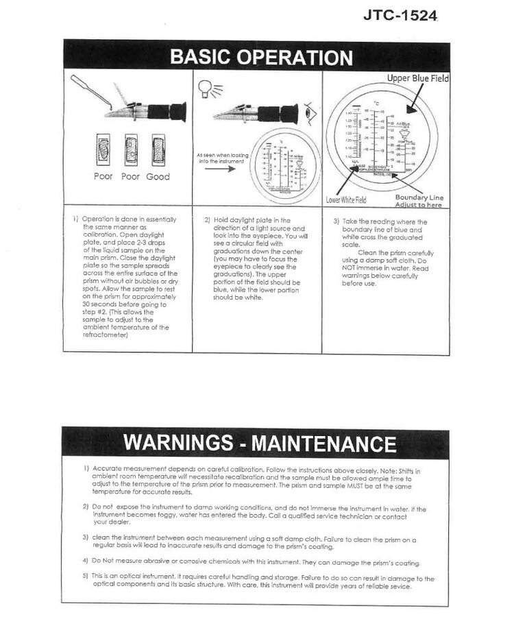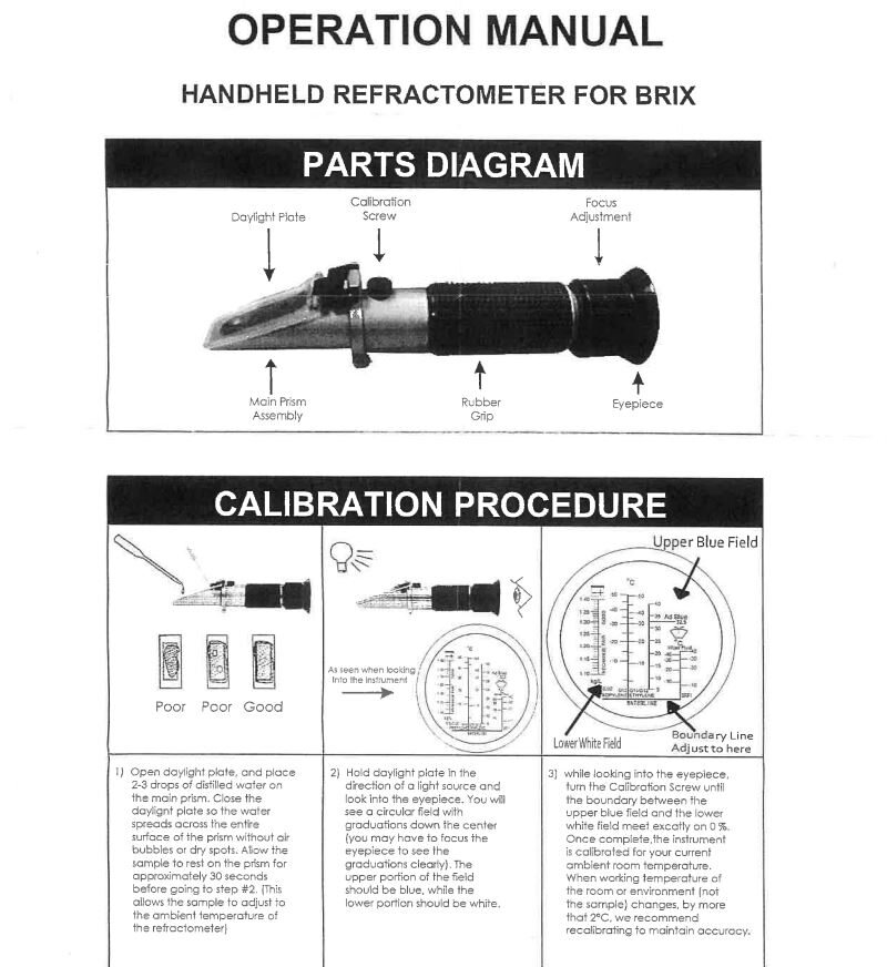 - Hold the refractometer up to a light, and then look into eyepiece. If the lower white field is not at waterline, then calibrate the refractometer.