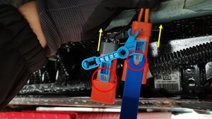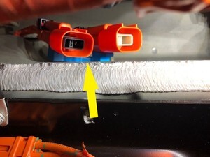 松开连接器锁,然后断开高压电池上的两个空调压缩机高压线束连接器。
