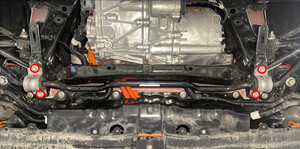 - 将右侧剪力板安装到后副车架上,然后安装新的大号螺栓,将右侧剪力板和后副车架固定到车身。