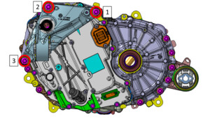 - 安装并手动拧紧将新的后驱动单元变流器固定到后驱动单元左侧变速箱的螺栓(12 个)。