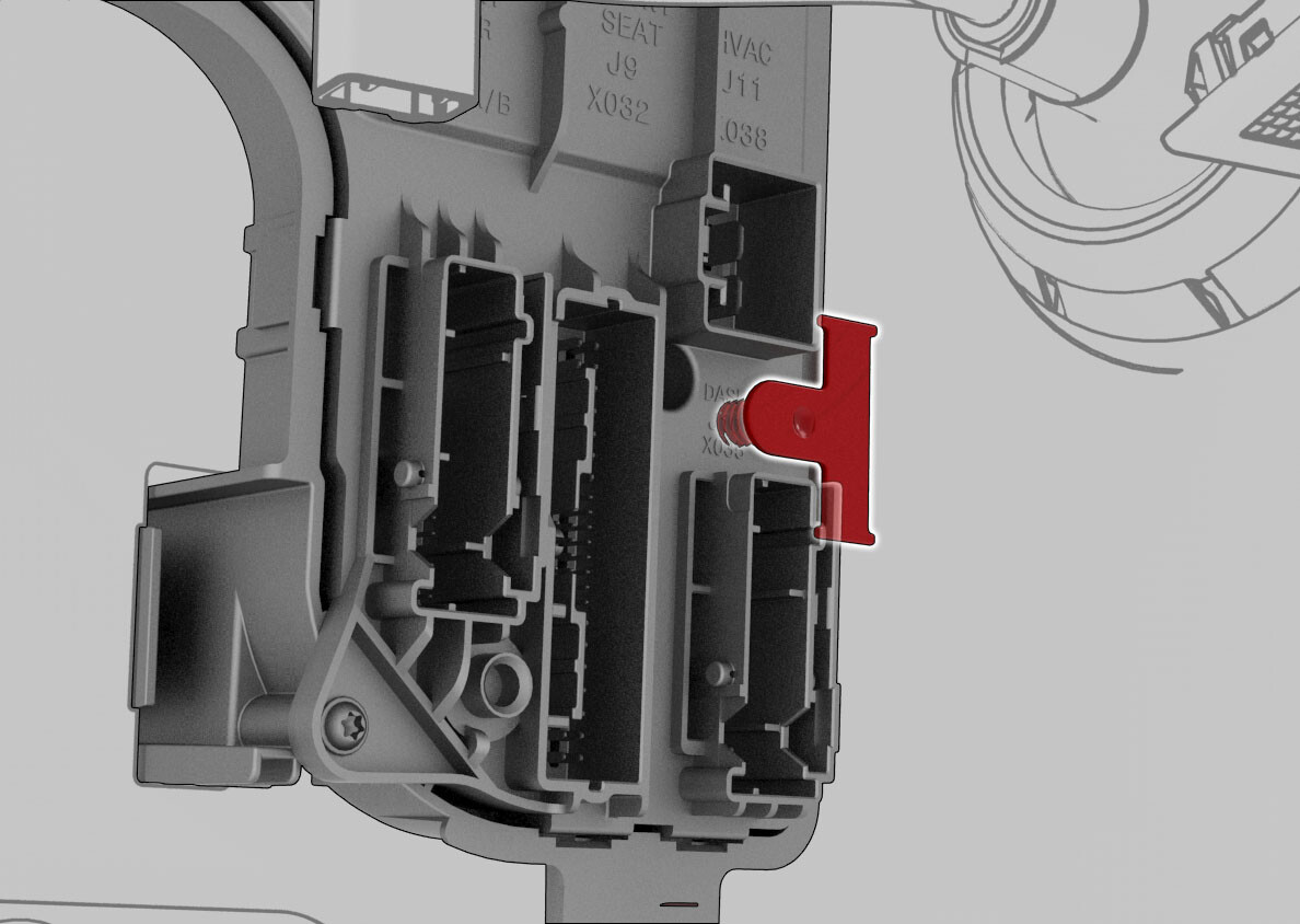 - 松开连接器锁,然后将 J9 驾驶位座椅电气连接器从左侧车身控制器模块上断开。