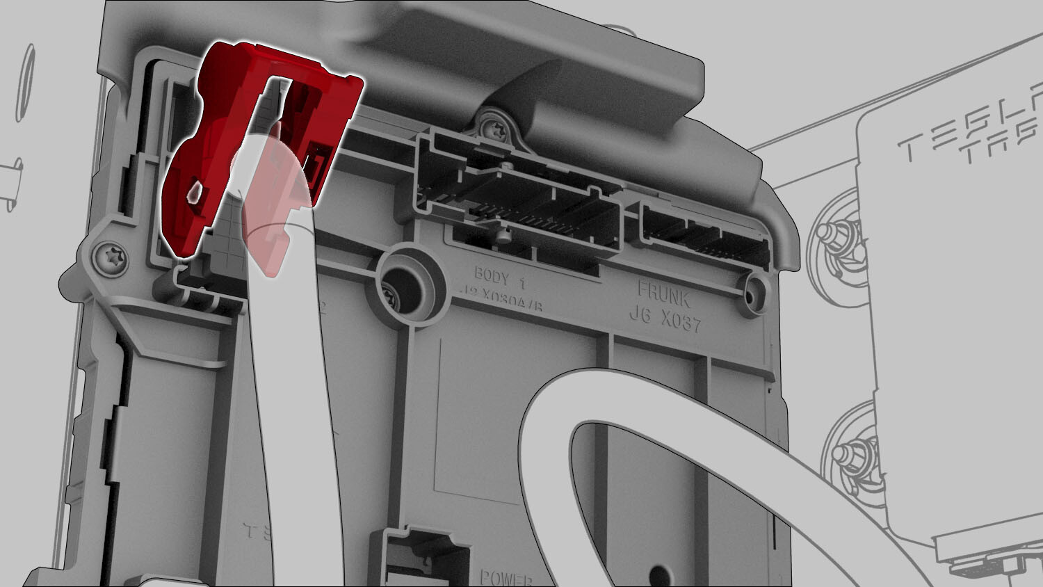 - 将 J6 前备箱前部储物连接器从左侧车身控制器模块上断开。