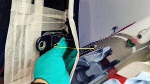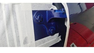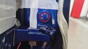 - 使用定位胶带确定 LH 后车门下部铰链在车身上的位置,然后用手拧紧将铰链固定到车身的螺栓。