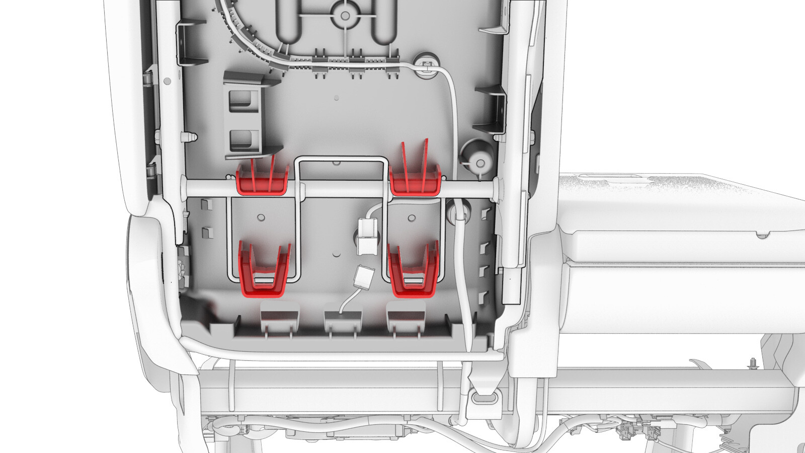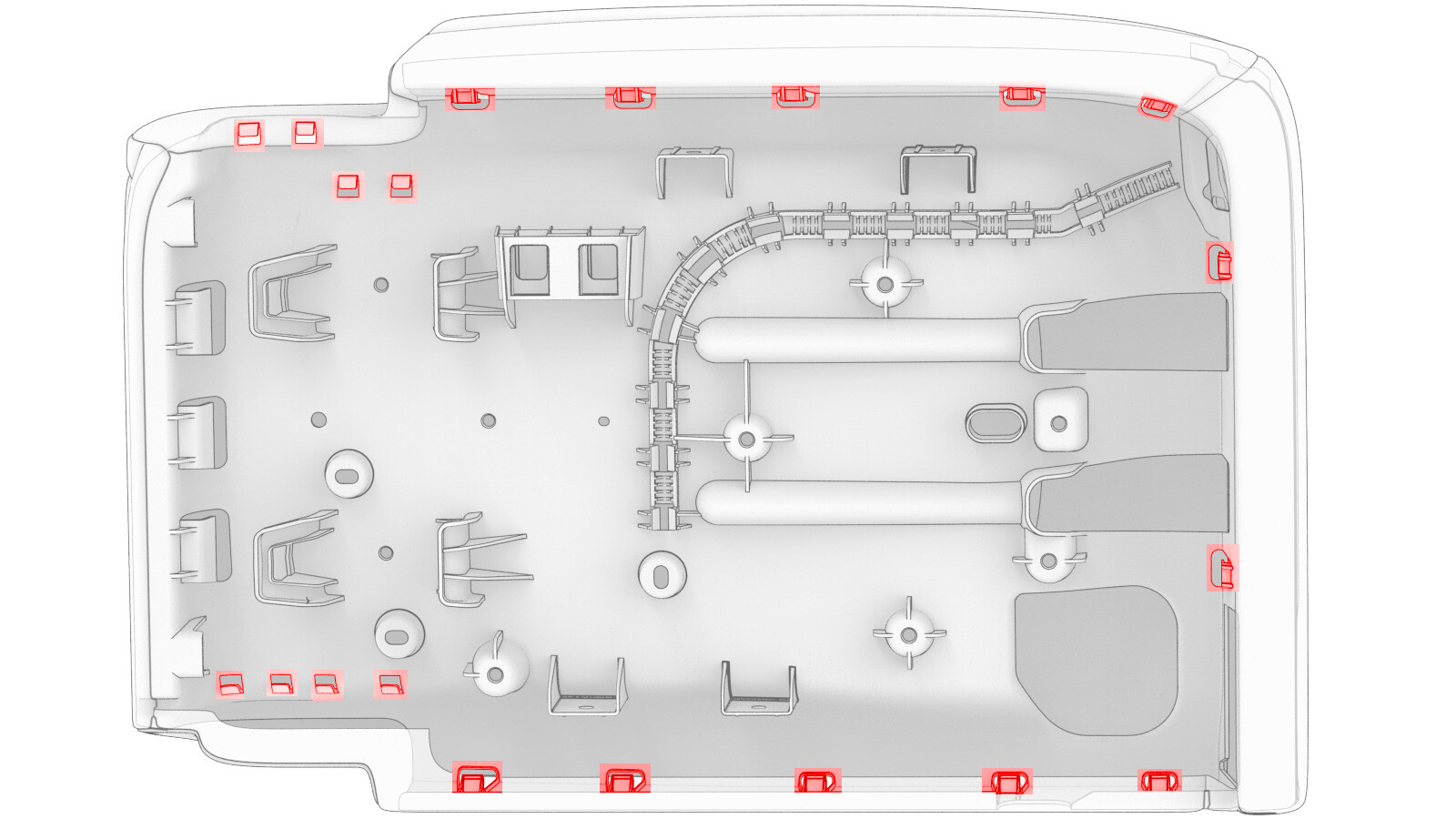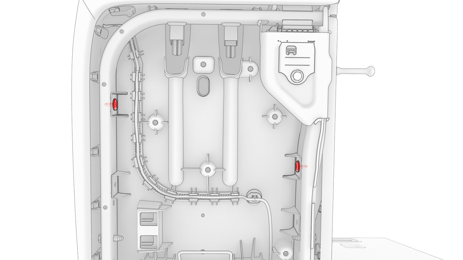 - 将用于固定第二排左侧座椅靠背蒙皮饰板翻板的挂钩和锁片(20 个)安装到蒙皮支架上。