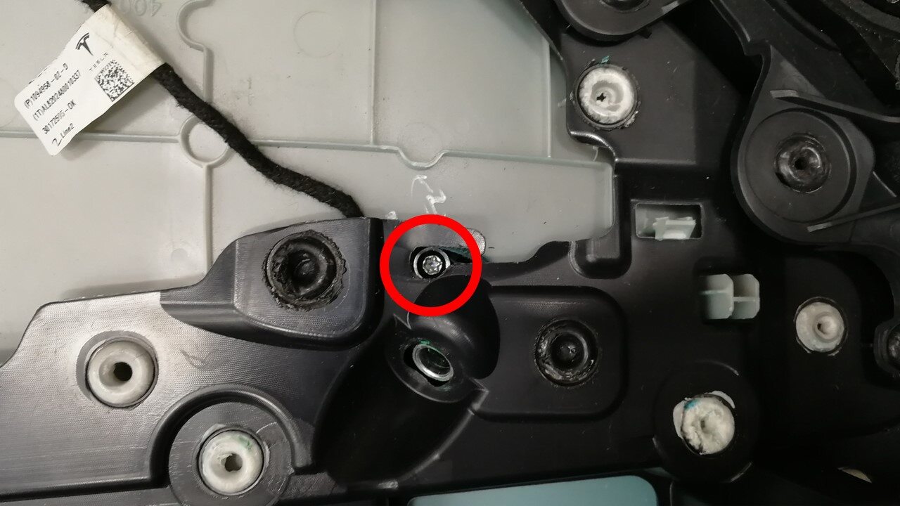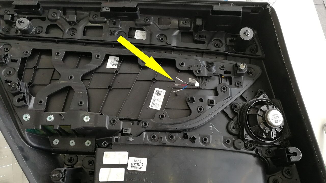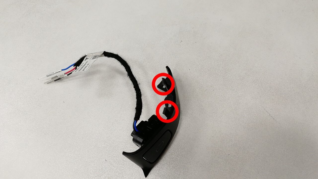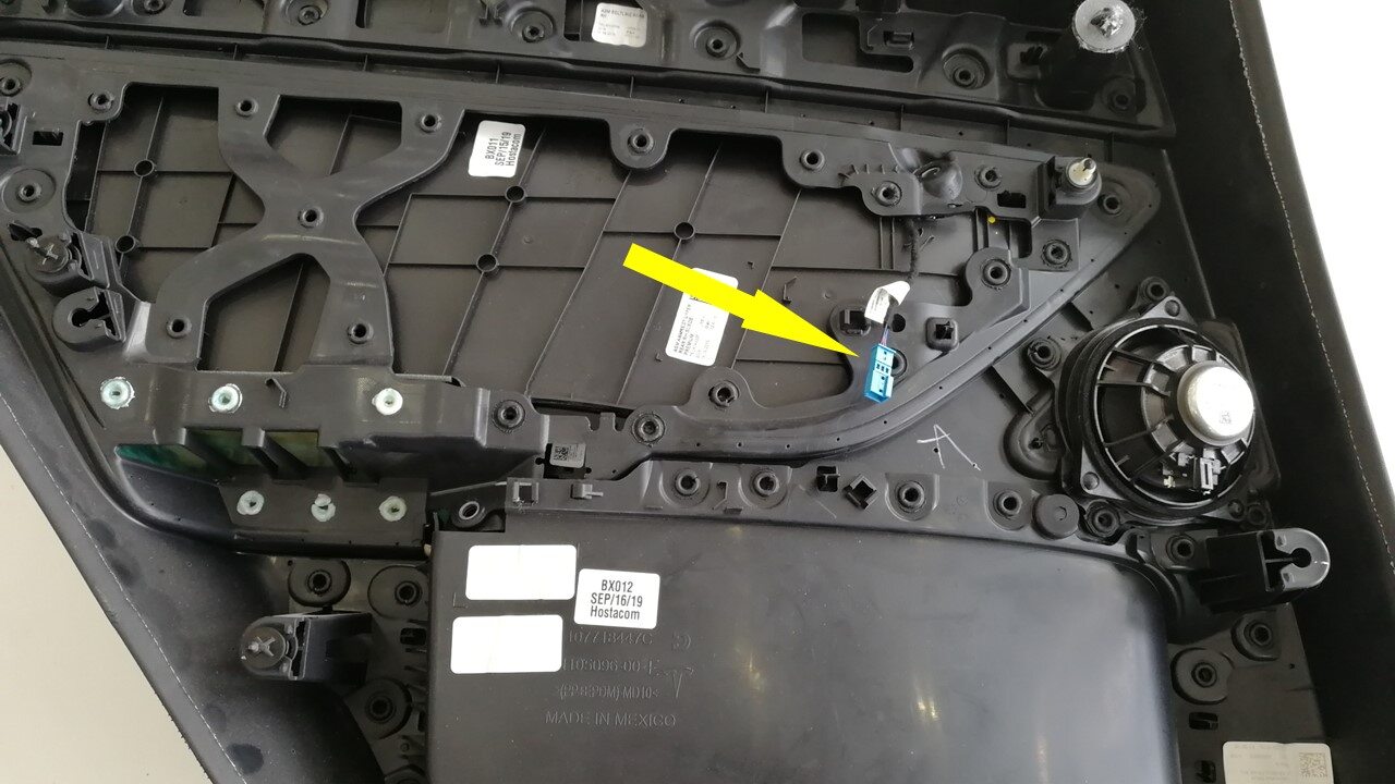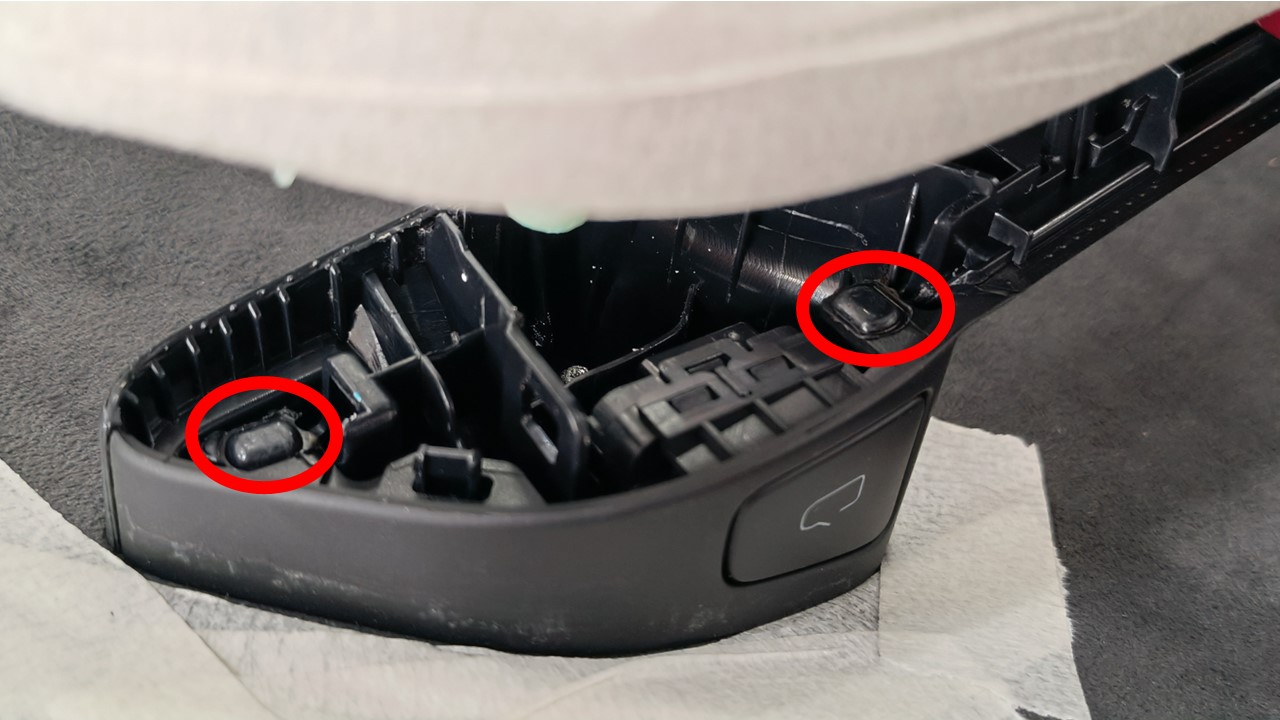 - 松开锁片 (x2),然后从车门饰板上拆下车门内部释放开关。