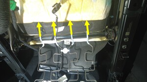 - 在协助下,将座椅主线束连接点下的固定卡子(4 个)从左前座椅框架上拆下。