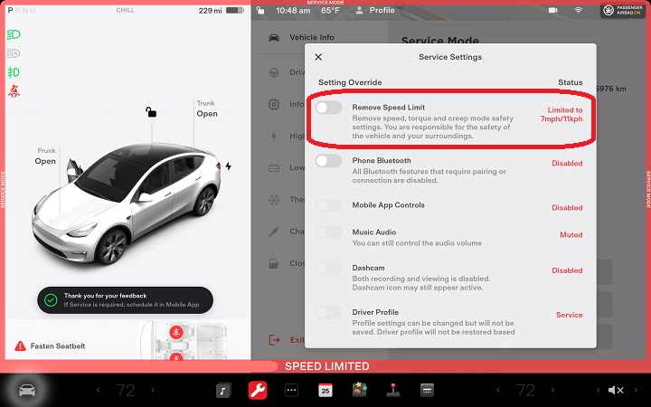 - 禁用触摸屏上的“限速”功能。点击Service > Service Settings > Remove Speed Limit。