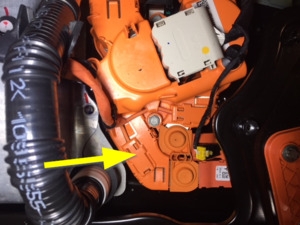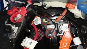 - 将高压电池仓线束夹从正极电池组触点开关上断开。