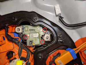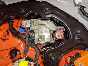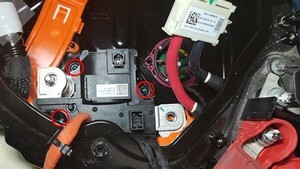 拆卸将正极电池组触点开关固定到高压电池仓的螺母(3 个)。