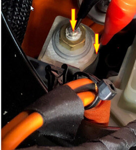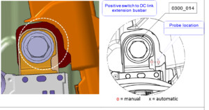 在正极电池组触点开关至直流链路母排的高压接头处执行 Hioki 阻抗测试。