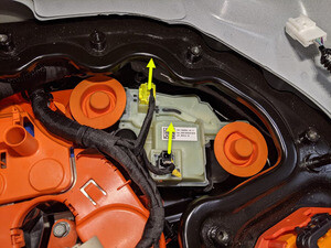 安装负极电池组触点开关区域周围的高压电池仓线束夹。
