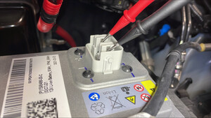 注Set multimeter to DC voltage, Confirm multimeter is properly measuring voltage by testing LV battery, Touch lightly and do not damage terminals