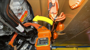 注Verify meter is zeroed out before performing measurement, Measure single cable. Verify ammeter is installed in correct direction. If current > 0.5A do not proceed with disconnecting HV connector. In this case, start vehicle electrical isolation again to make sure that all was properly shut down. Escalate for assistance as requiredIf current < 0.5A, Ok to disconnect and check voltage at HV plug on the battery side.