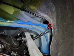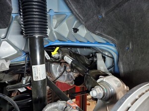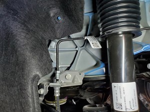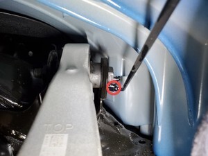 注2x bolts, 10mm, 5 Nm, Pivot forward edge down past frunk assembly, then carefully move rear edge past brake reservoir and into position