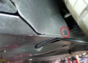 Loosen large bolt securing RH shear plate and subframe to body and rotate shear plate clear of HV battery