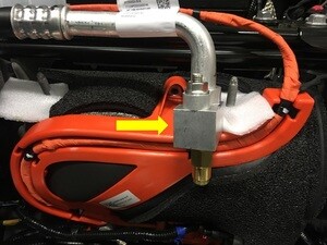 注确保高压线束支架与空调压缩机顶部的线束支座接合。