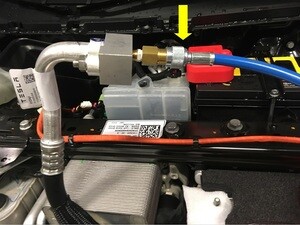 将直线管路 R1234yf 管嘴与高压适配器单元相连。