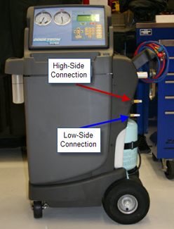 Connect the high and low pressure hoses from the R134a recovery/charging station to the connectors on the vehicle.