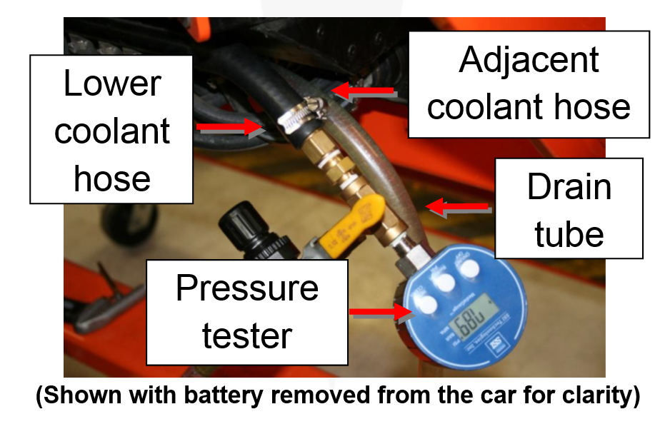 Attach the Battery cooling system pressure tester (1008787-00-A) to the lower hose.