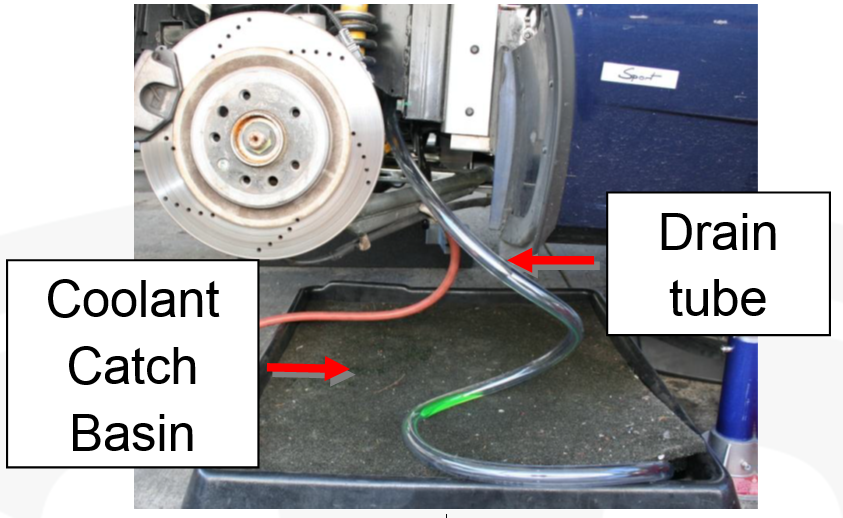 Set up a drain tube with one end in the coolant catch basin and have the other end ready for the next step.